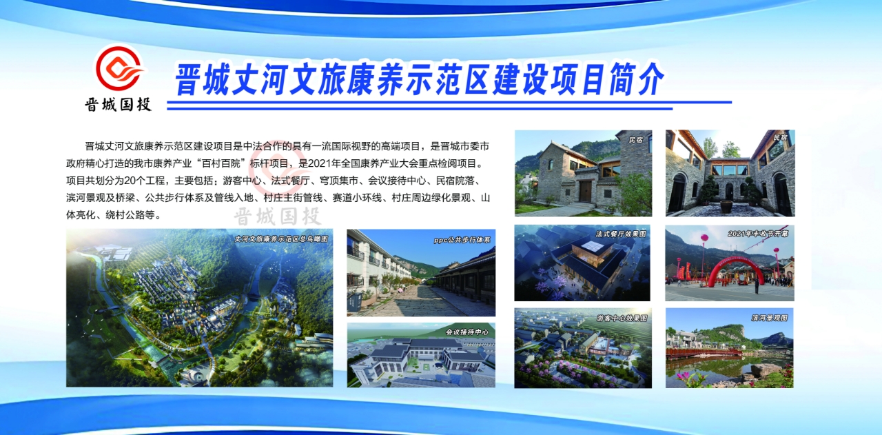 晋城丈河文旅康养示范区建设项目是中法合作的具有一流国际视野的高端项目,是晋城市委市政府精心打造的我市康养产业“百村百院”标杆项目,是2021年全国康养产业大会重点检阅项目。项目共划分为20个工程,主要包括:游客中心、法式餐厅、穹顶集市、会议接待中心、民宿院落、滨河景观及桥梁、公共步行体系及管线入地、村庄主街管线、赛道小环线、村庄周边绿化景观、山体亮化、绕村公路等。